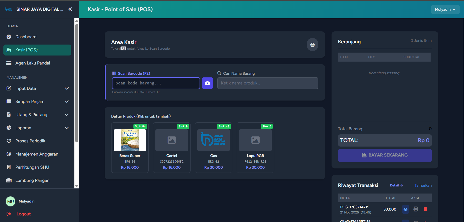 - Dual Input Mode: Dukungan penuh untuk Barcode Scanner (USB) dan Scan Kamera HP untuk input produk super cepat.