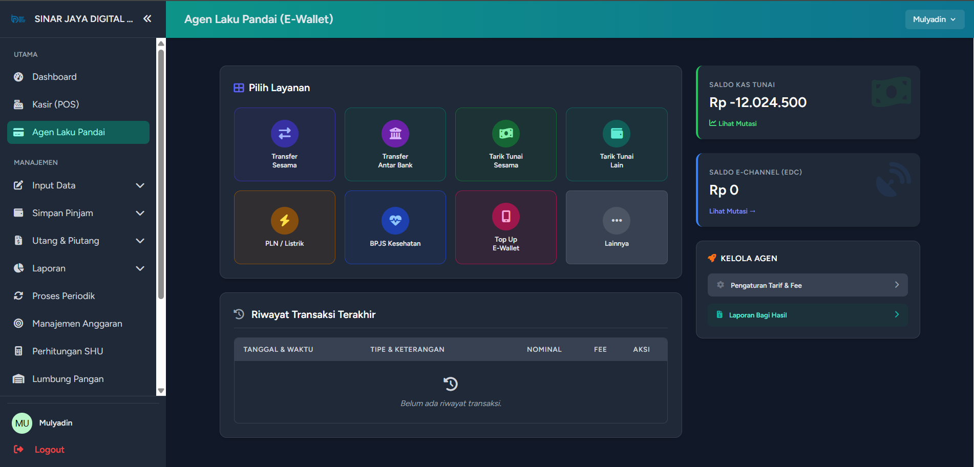 - Dashboard E-Wallet: Pantau saldo Kas Tunai dan Saldo E-Channel (Mesin EDC) dalam satu layar.