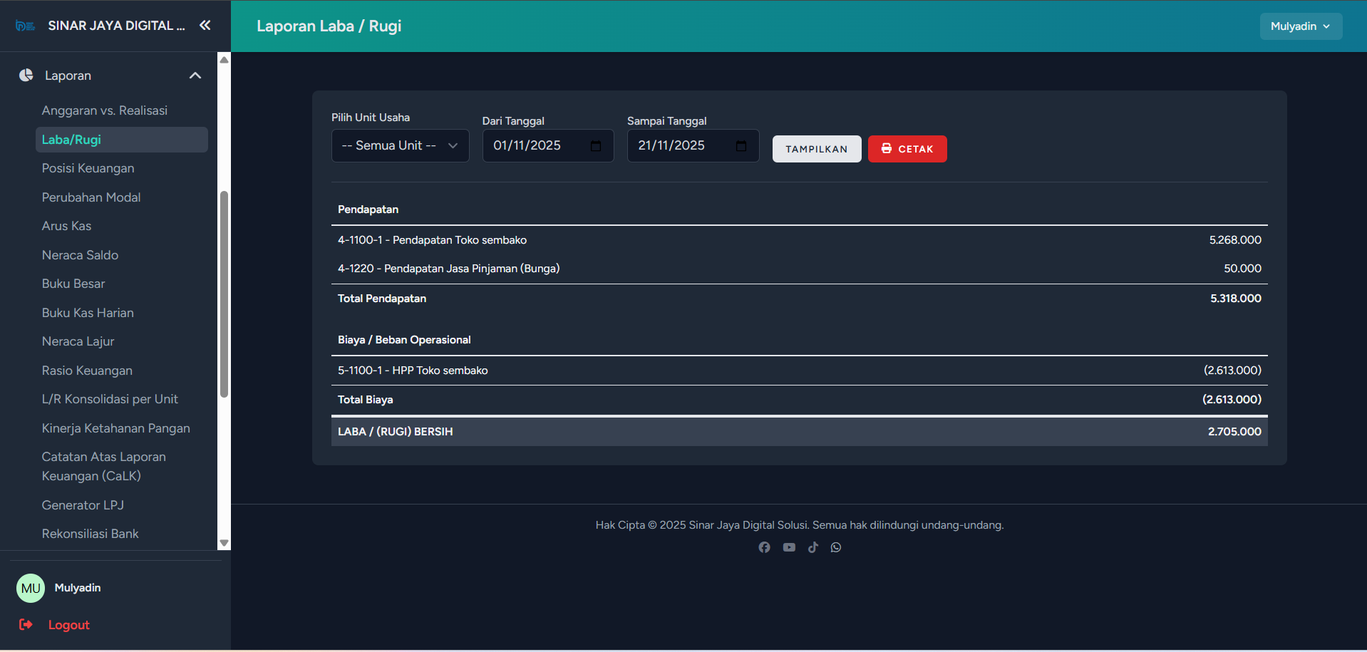 - Laporan Laba Rugi: Bisa difilter per Unit Usaha atau Konsolidasi (Gabungan).